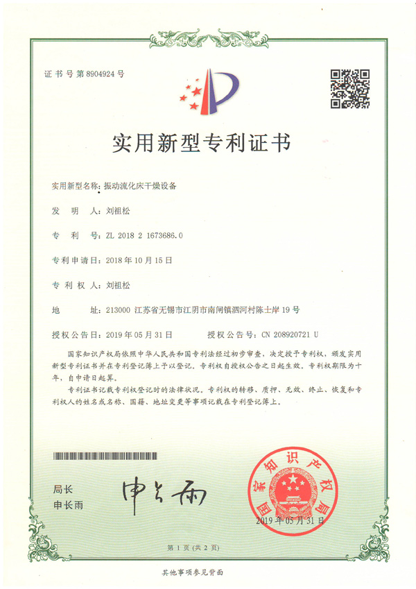 關鍵詞:常州榮發干燥成功申請振動流化床干燥機專利證書!